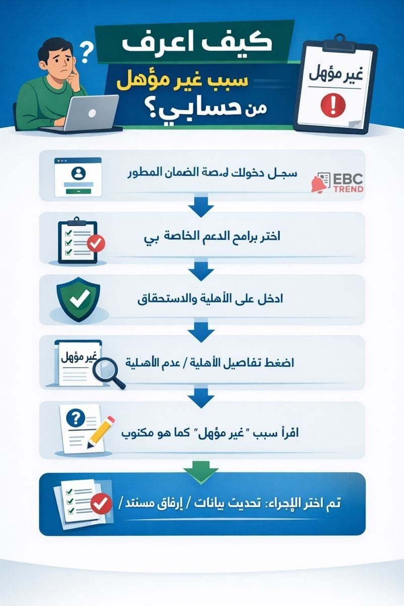 تظهر حالة غير مؤهل في الضمان الاجتماعي المطور لأسباب متعددة، وغالبًا لا تعني الرفض النهائي بقدر ما تعني وجود معلومة تحتاج تصحيح أو شرط لم يكتمل أو دخل محتسب تجاوز الحد المانع للأسرة، هنا ستتعرف على أسباب عدم الأهلية في الضمان المطور الأكثر شيوعًا: